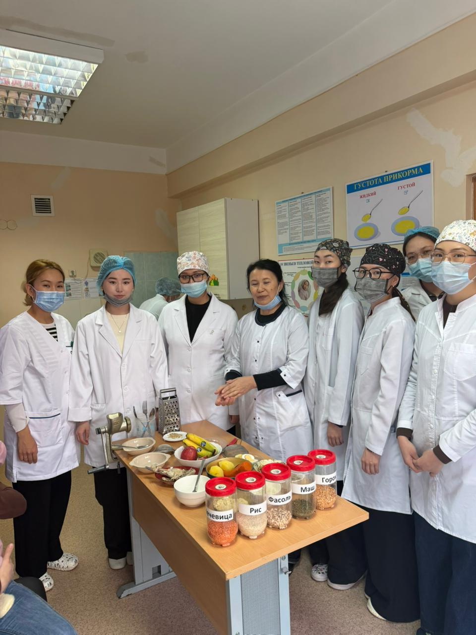 В городской поликлинике №8 при участии ассистента КазНМУ им. С.Д. Асфендиярова Бокетовой Б.Н., студентов 5 курса факультета «Педиатрия» (группа 021-001), медицинской сестры кабинета развития ребёнка Куатбаевой У.А., врача по формированию здорового образа жизни Берекешовой А.А., а также участковых патронажных медицинских сестёр был проведён мастер-класс для родителей по введению прикорма детям.